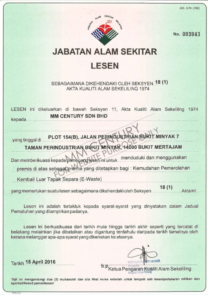 Recognising the growing challenge of electronic waste, we ventured into the e-waste industry and obtained Partial Recovery SW110 licence from the Department of Environment (DoE), cementing our role as a responsible handler of hazardous and technology-related waste.