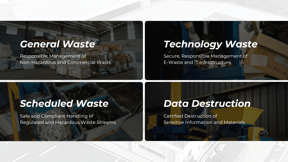 As Malaysia’s trusted environmental solutions provider, we anchor our operations around four core pillars. These pillars represent the waste streams we manage, the services we optimise, and the environmental outcomes we help clients achieve every day.